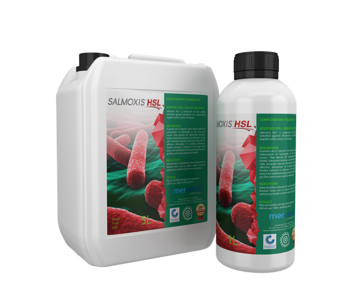 SalmoXis®HSL is composed of stabilzed organic acids together with a blend of non-synthetic, natural bioactive compounds. Mercordi® developed Salmoxis®HSL, a heat stable, non-antibiotic liquid product, to control salmonella infections in the animal industry.